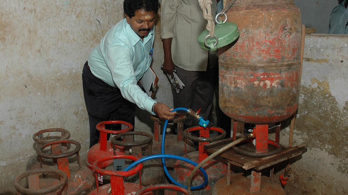 एक अवैध गैस रिफिलिंग यूनिट का निरीक्षण करने वाले अधिकारियों की एक फ़ाइल तस्वीर। | फोटो क्रेडिट: केवल प्रतिनिधित्व के लिए फोटो