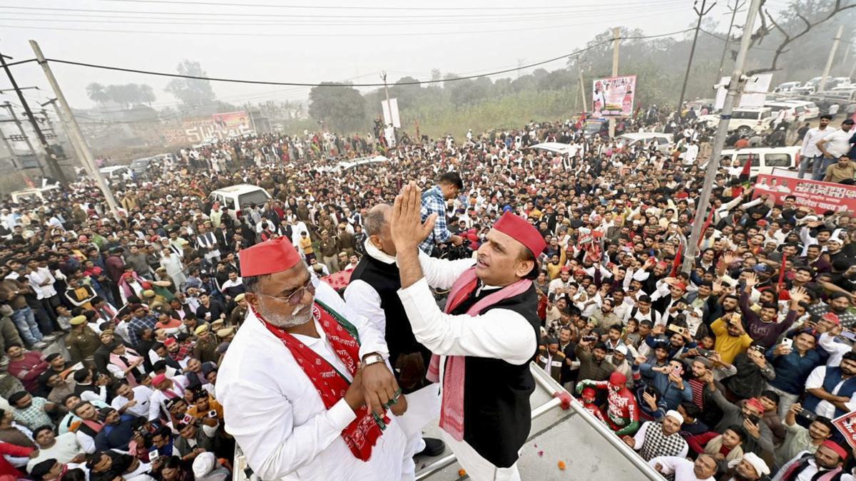 समाजवादी पार्टी के अध्यक्ष अखिलेश यादव सोमवार (नवंबर 18, 2024) को मीरापुर विधानसभा सीट पर उपचुनाव के लिए रोड शो के दौरान। | फोटो साभार: पीटीआई
