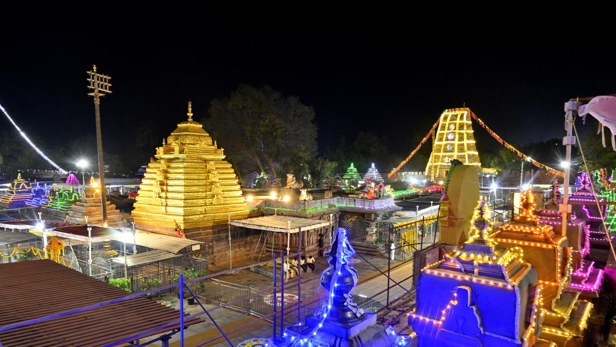श्री भृमारम्बा मल्लिकरजुन स्वामी मंदिर में श्रीसैलम में हाल ही में महासिवरत्री समारोहों के लिए रोशनी के साथ रोशनी हुई। फ़ाइल फोटो | फोटो क्रेडिट: हिंदू